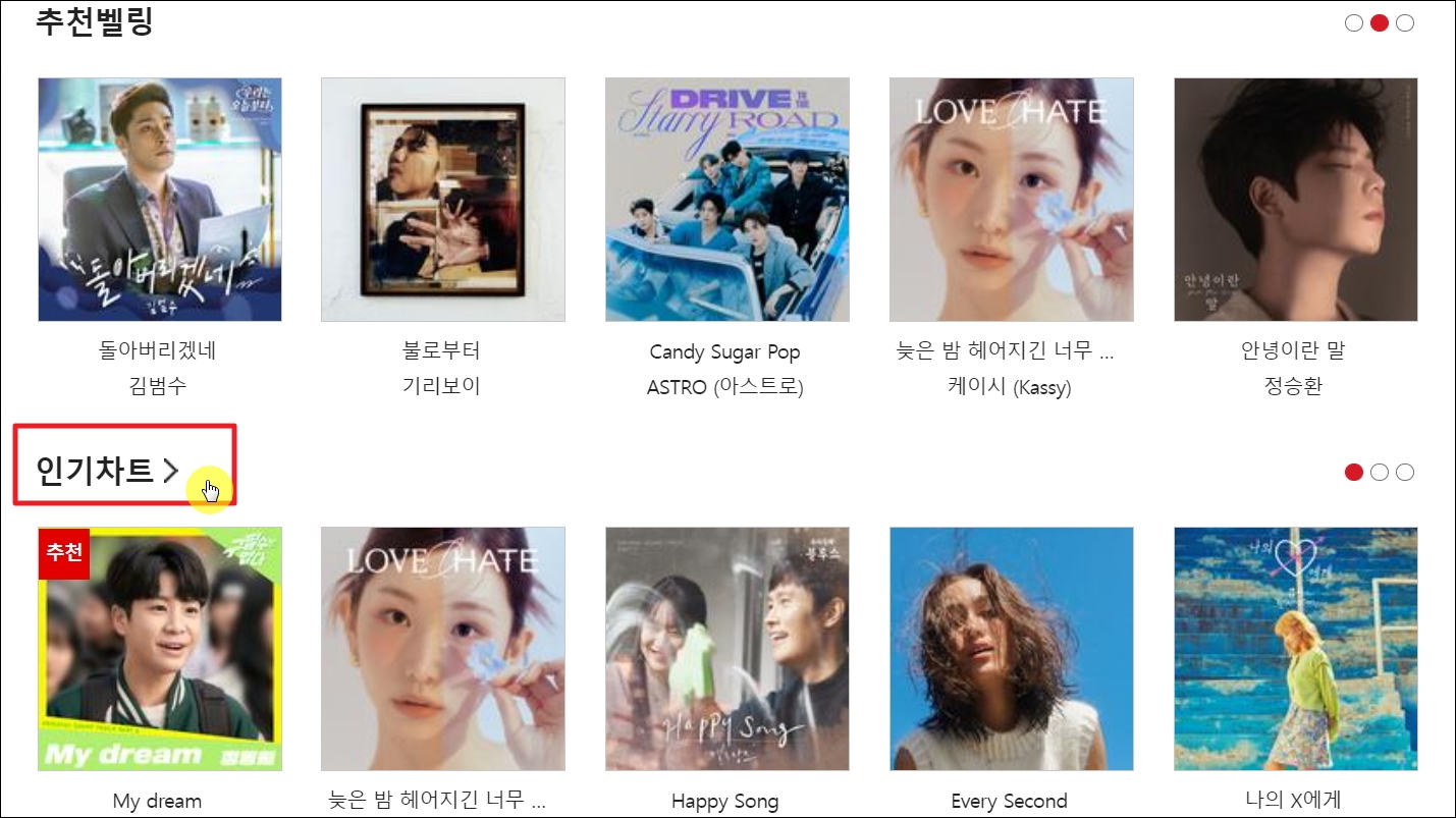 ▼화면을 아내로 내려보면 최신 인기차트를 만나볼 수 있습니다. 요즘에는 My dream, 늦은 밤 헤어지긴 너무, Happy Song, Ever Second가 순위권에 있네요. 여기에서 [인기차트]를 클릭해 보겠습니다.