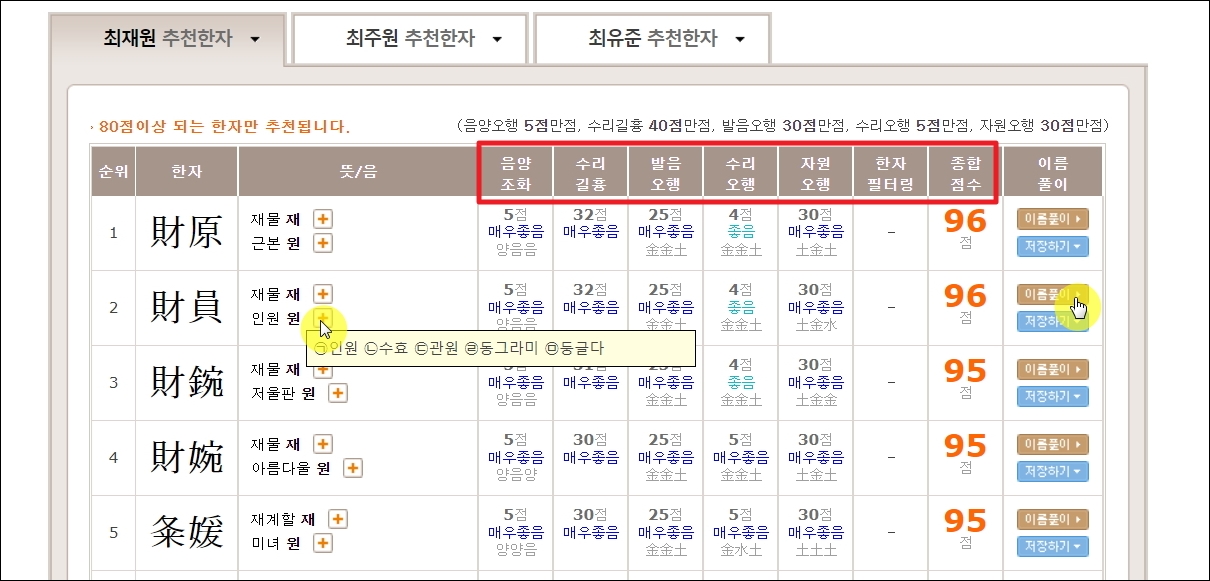 ▼한자 추천 페이지가 열렸습니다. 음양조화, 수리오행, 자원오행, 발음오행 등을 기준으로 얼마나 좋은지 평가 결과를 확인할 수 있습니다. 최종적으로 계산된 종합점수를 통해 어떤 한자가 가장 나은지 확인이 가능합니다. 한자까지 선택했으면 [이름풀이] 버튼을 눌러보세요.