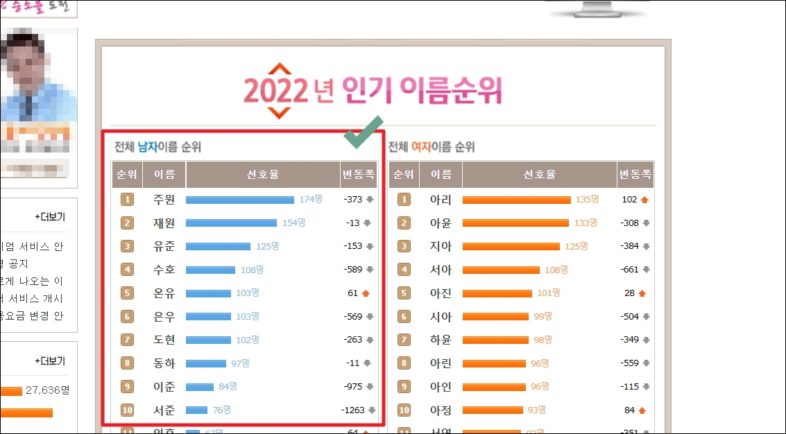 | 아기 이름 순위 확인하기 (올해 2022년 선호도 포함) (0) | 2022.06.30 |