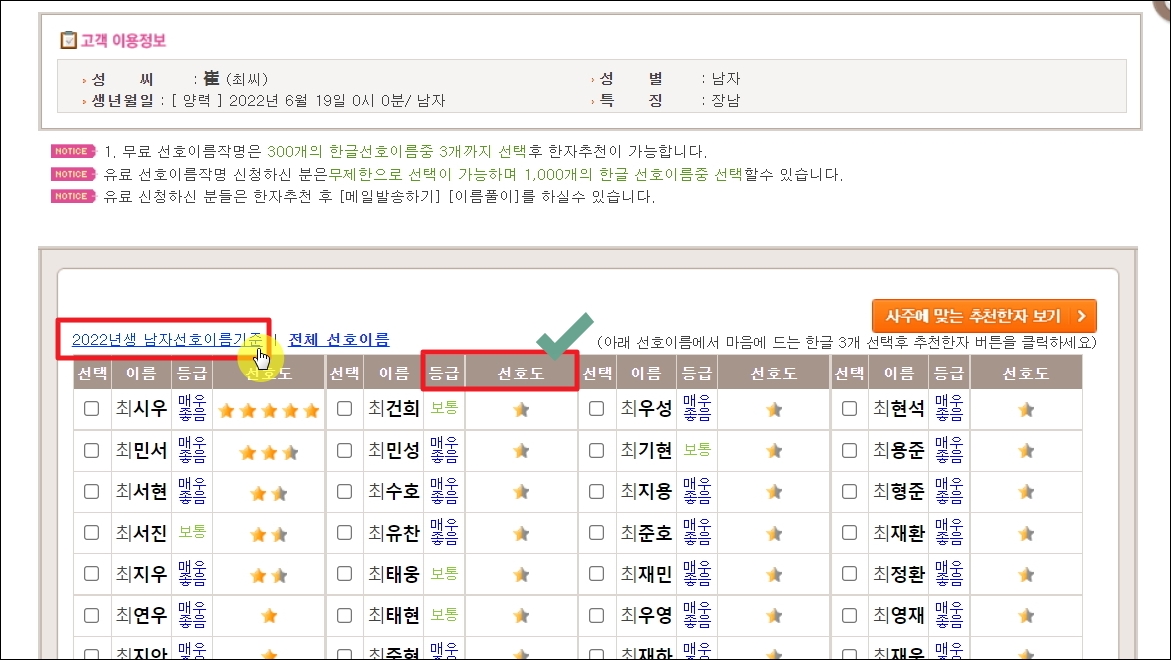 ▼결과가 나왔습니다. 300개의 이름 모음으로 된 표로 되어 있습니다. 각 성명을 보면 등급과 선호도가 표시되어 있어서 얼마나 좋은지 또는 얼마나 인기가 있는지 쉽게 파악이 가능합니다. 2022년생을 위한 모음 자료도 따로 마련되어 있습니다.