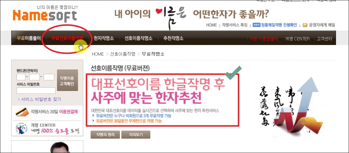 ▼그럼 본격적으로 남자 이름 모음을 찾아보도록 하겠습니다. 메뉴에서 [무료 선호 이름 작명] 버튼을 클릭합니다. 안내에 나와 있듯이 사주에 맞는 한자를 추천 받을 수 있습니다. 사주를 반영한 것이기 때문에 앞으로의 운세에 좋은 영향을 줄 수 있을 겁니다.