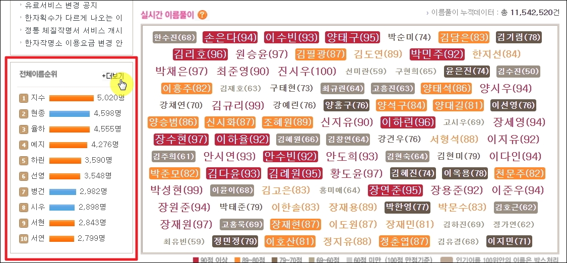 ▼네임소프트 사이트에 접속하면 메인화면에 [전체 이름 순위]가 있습니다. 해당 영역에서 [더보기] 버튼을 클릭하면 앞서 확인한 순위표를 볼 수 있습니다. 옆에는 실시간 이름풀이 결과 모음이 나타나는데, 점수가 표시되어 있기 때문에 어떤 성명이 어떤 평가를 받았는지 확인이 가능합니다.