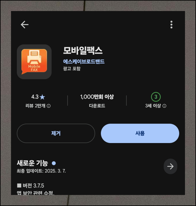 구글 플레이 스토어에서 "모바일팩스"를 검색해보세요. 에스케이 브로드밴드에서 개발한 공식 앱을 찾아서 다운로드하면 됩니다.