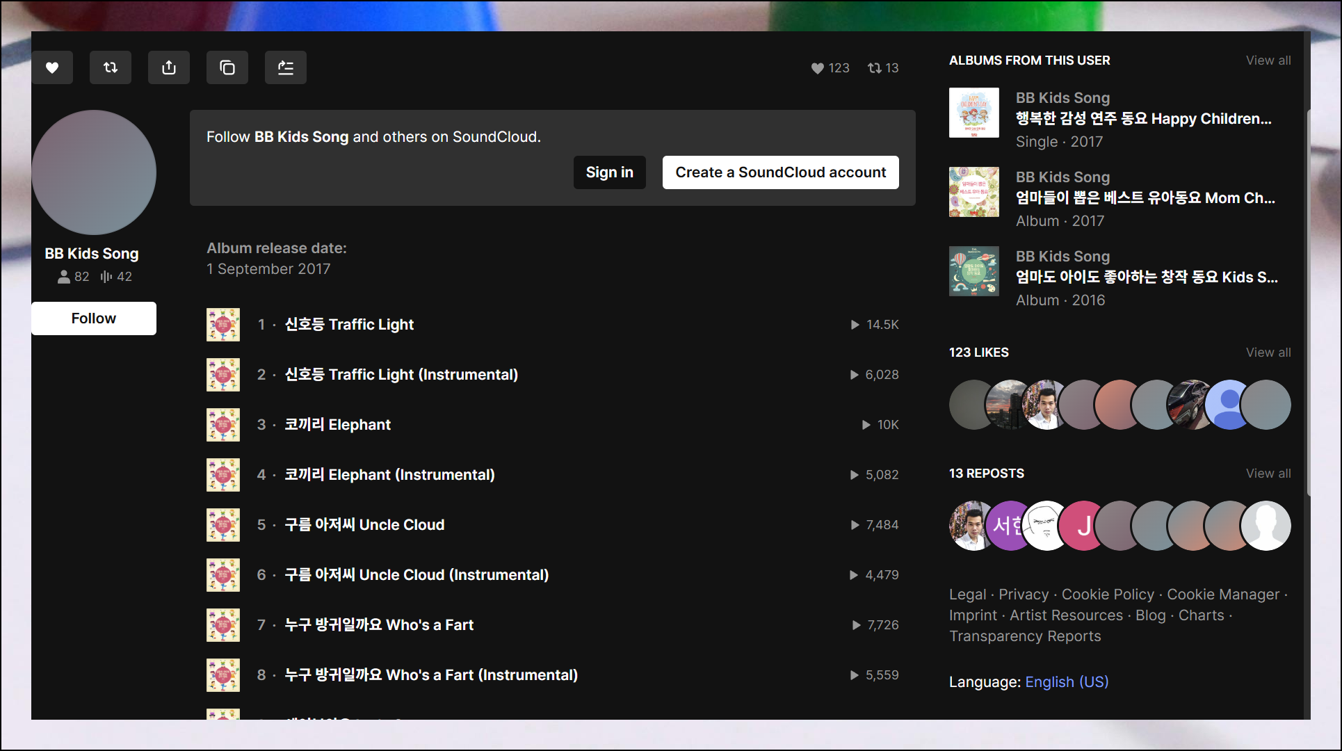 저는 평소 이용하는 특별한 음악 플랫폼을 소개해드리고 싶어요. 국내에서는 아직 많이 알려지지 않은 곳이지만, 어마어마한 양의 아기 동요를 연속으로 감상할 수 있는 사이트입니다. 여기서는 정말 다양한 길이의 트랙들을 만날 수 있는데, 짧게는 몇 분짜리 곡부터 길게는 몇 시간 동안 이어지는 긴 곡까지 선택할 수 있어요.