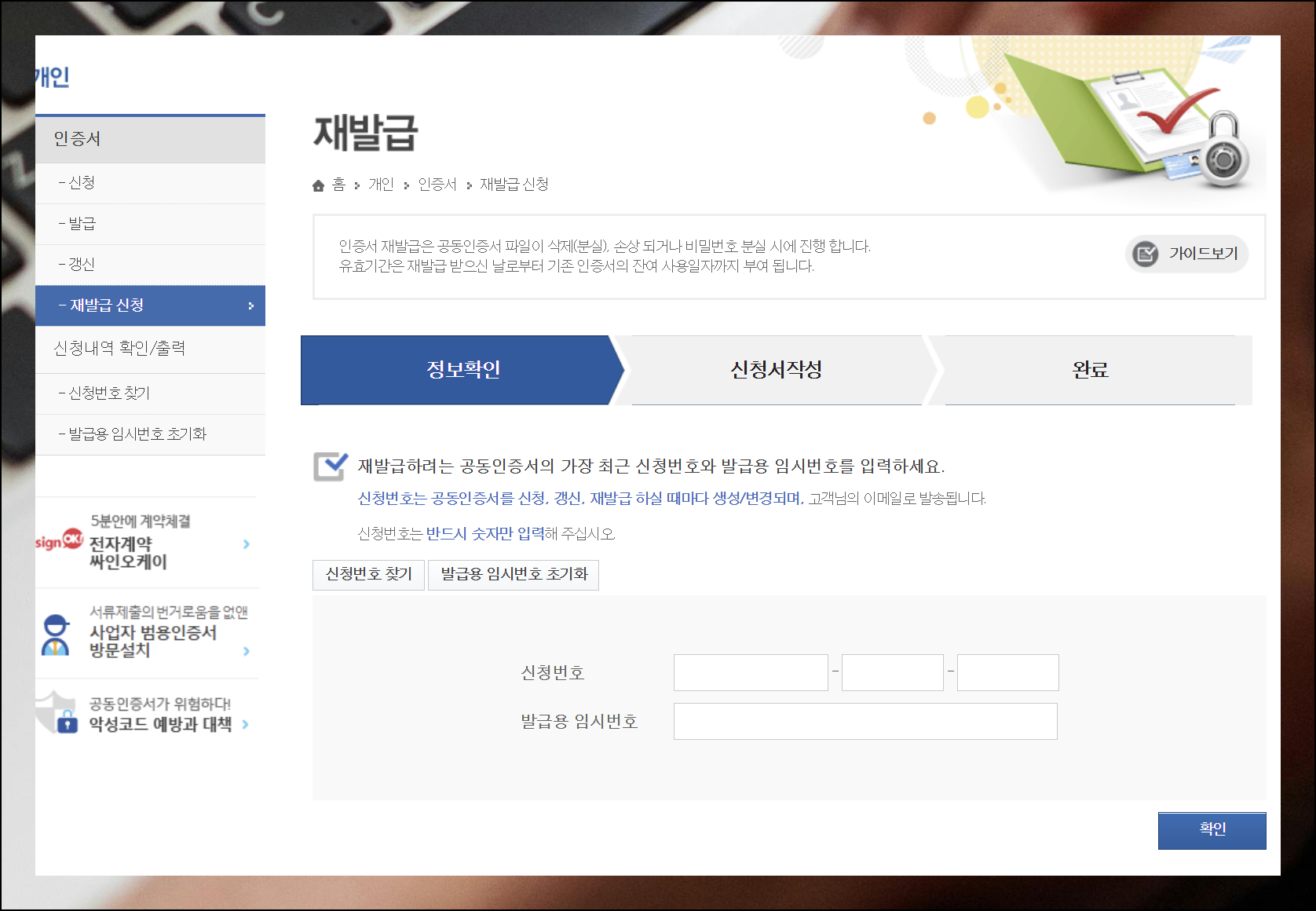 왼쪽 메뉴에서 재발급 신청 메뉴를 찾아 클릭하세요. 재발급 전용 페이지로 이동한 후 신청번호와 임시번호를 정확히 입력해야 합니다. 모든 정보 입력이 끝나면 확인 버튼을 눌러 다음 단계로 진행하세요.