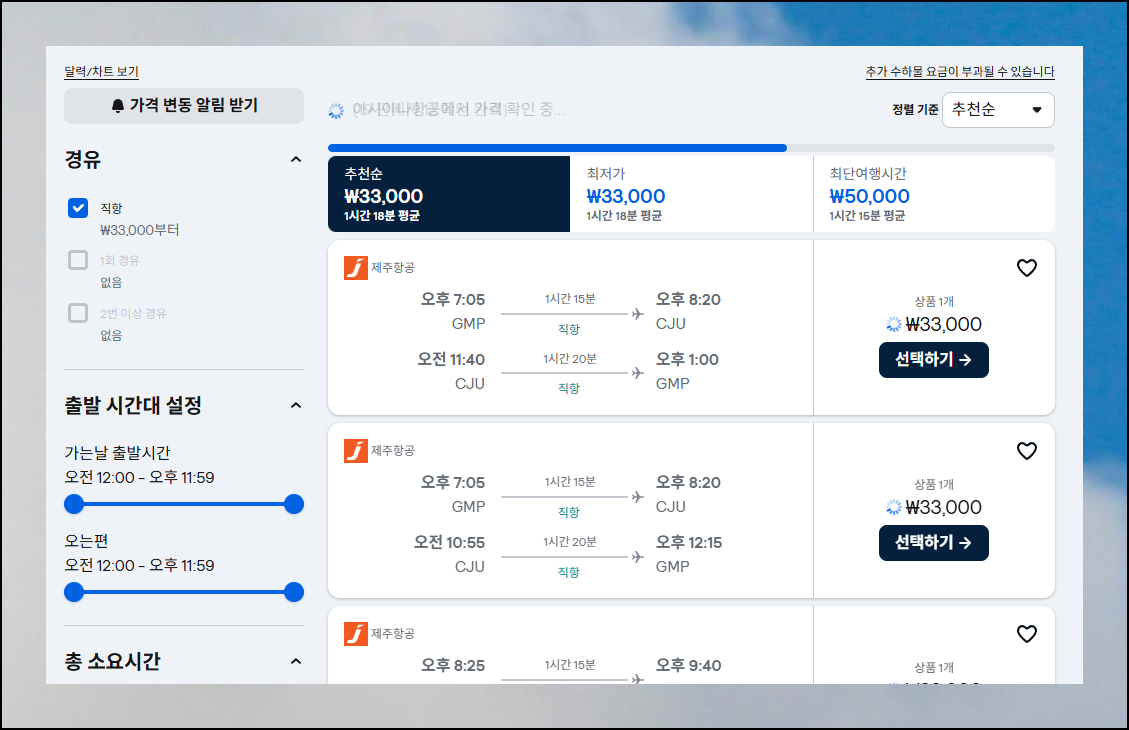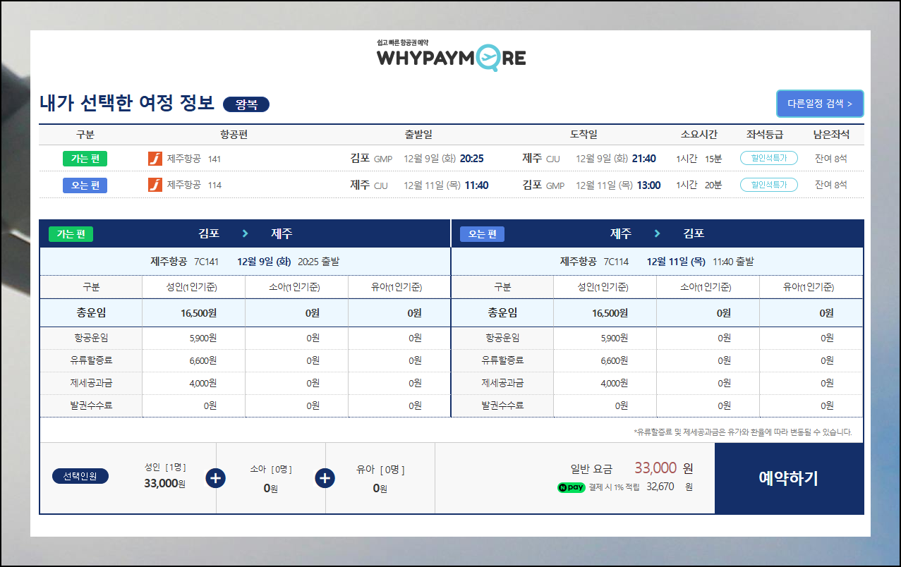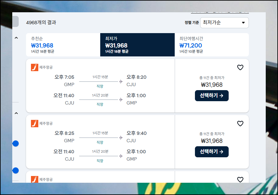 희망하는 항공권을 찾으셨다면 예약 버튼을 클릭해보세요. 직항과 경유, 출발 시간대 등을 설정할 수 있는데 편리할수록 요금이 상승하는 경향이 있어요. 제주도 직항편이 편하긴 하지만 경유편까지 고려하시면 더 저렴한 선택지를 찾을 수 있습니다.