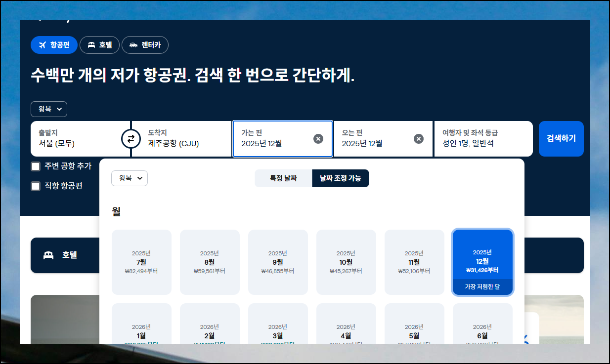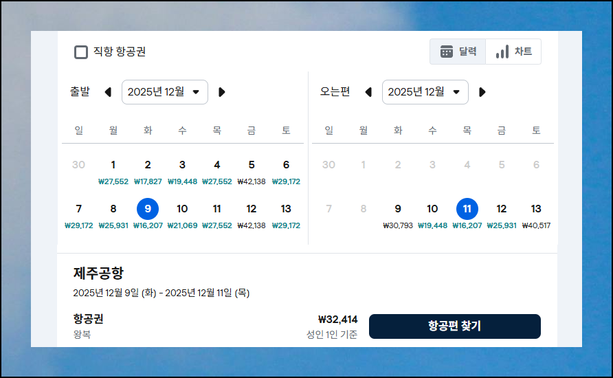 출발지와 도착지를 입력한 뒤 한 달 전체 기간으로 검색해보세요. 이 방식으로 월간 최저가 항공권을 한눈에 파악할 수 있어요. 2025년 12월을 기준으로 조회해보니 다양한 특가 상품들이 보이네요. 성수기를 벗어난 날짜로 여행 일정을 조정하면 비용을 크게 줄일 수 있습니다.