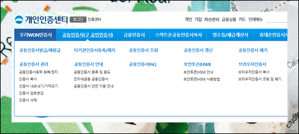 현재는 공인인증서 대신 "공동인증서"라는 용어를 사용하고 있어요. 명칭이 바뀌었을 뿐 실제 기능은 예전과 거의 동일합니다. 인증센터 화면으로 이동한 후에 메뉴 위에 커서를 놓아보세요. 그러면 무료 공인인증서 발급을 비롯해서 재발급, 등록, 해지, 조회, 갱신, 폐기 등 여러 서비스 항목들이 드롭다운으로 나타나요. 이 중에서 발급 항목을 선택하시면 됩니다.