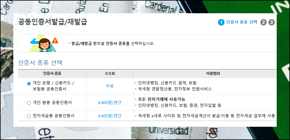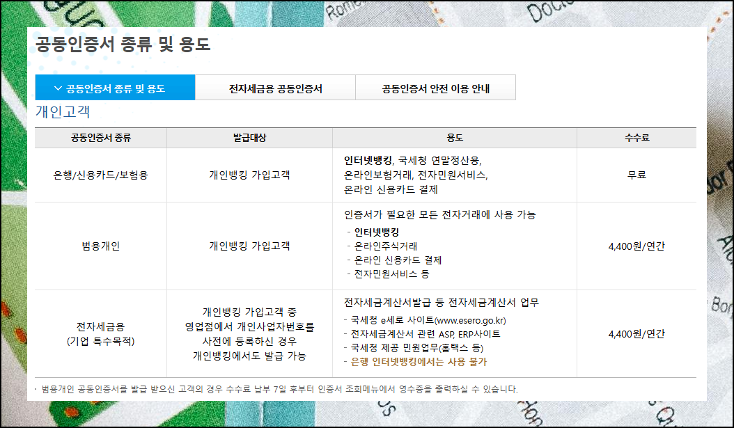 서비스 종류를 선택하는 새로운 페이지가 열리게 돼요. 여기서 여러 가지 인증서 종류를 선택할 수 있어요. 우리가 발급 받으려고 하는 무료 공인인증서로는 인터넷뱅킹 서비스나 신용카드 온라인 결제가 가능해요. 국세청 연말정산 처리나 전자정부 각종 민원 서비스도 이용할 수 있습니다. 세금계산서를 직접 발급하거나 전자입찰 관련 업무를 처리하려면 범용이나 전자세금용이 필요한데요. 일반 개인이 보통 활용하는 용도라면 해당 인증서만으로도 충분합니다.