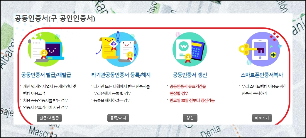 각자가 자주 사용하는 메인 은행이 있을 거예요. 제가 과거에 우리은행을 주로 활용했던 것처럼 말이죠. 이런 주거래 은행을 통해서 무료 공인인증서를 간편하게 받을 수 있습니다. 은행 홈페이지에 접속해서 어떤 절차로 진행되는지 차근차근 설명해 드릴게요. 모든 은행 웹사이트에는 공통적으로 인증센터라는 메뉴가 마련되어 있어요. 이 메뉴를 클릭하시면 다음 단계로 넘어갈 수 있습니다.