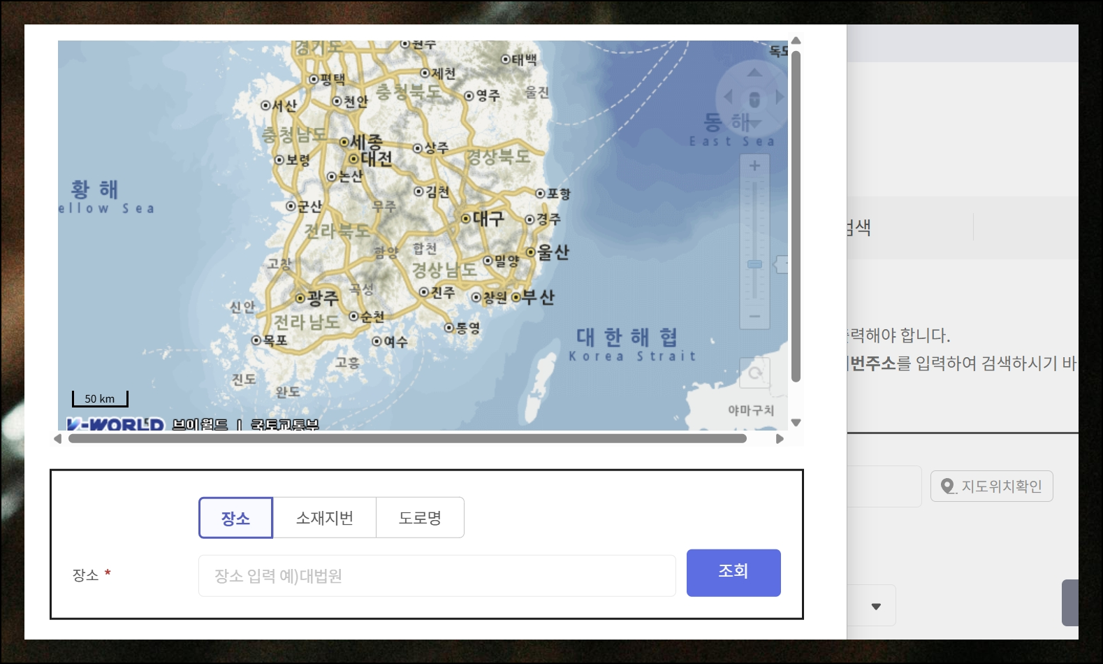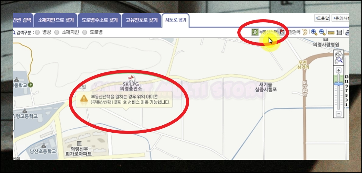 화면에 지도가 로딩되면 등기부등본이 필요한 특정 지역을 마우스로 탐색해보세요. 마우스 휠 조작으로 지도를 확대하거나 축소할 수 있습니다. 원하는 위치를 정확히 찾았다면 화면 우측 상단에 위치한 부동산 선택 버튼을 클릭하세요.
