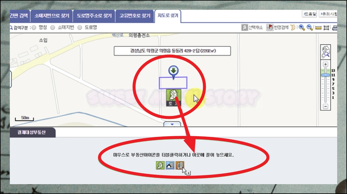 알아보고 싶은 토지에 대한 구체적인 지역을 클릭하면 해당 지역의 상세 주소가 화면에 표시됩니다. 토지를 나타내는 아이콘을 마우스로 더블클릭하거나 화면 하단 영역으로 드래그하여 이동시키면 돼요.