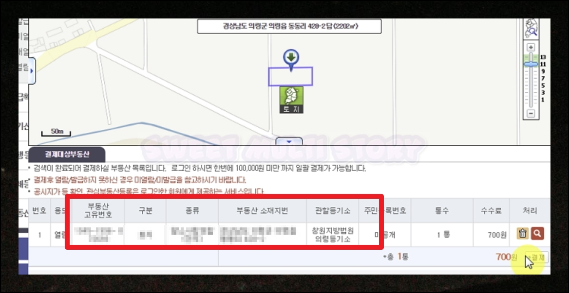 제공되는 정보만으로는 부족하다고 판단되시면 유료 서비스를 이용하시면 됩니다. 토지 등기부등본 1통을 완전히 열람하는데 필요한 수수료는 700원이에요.