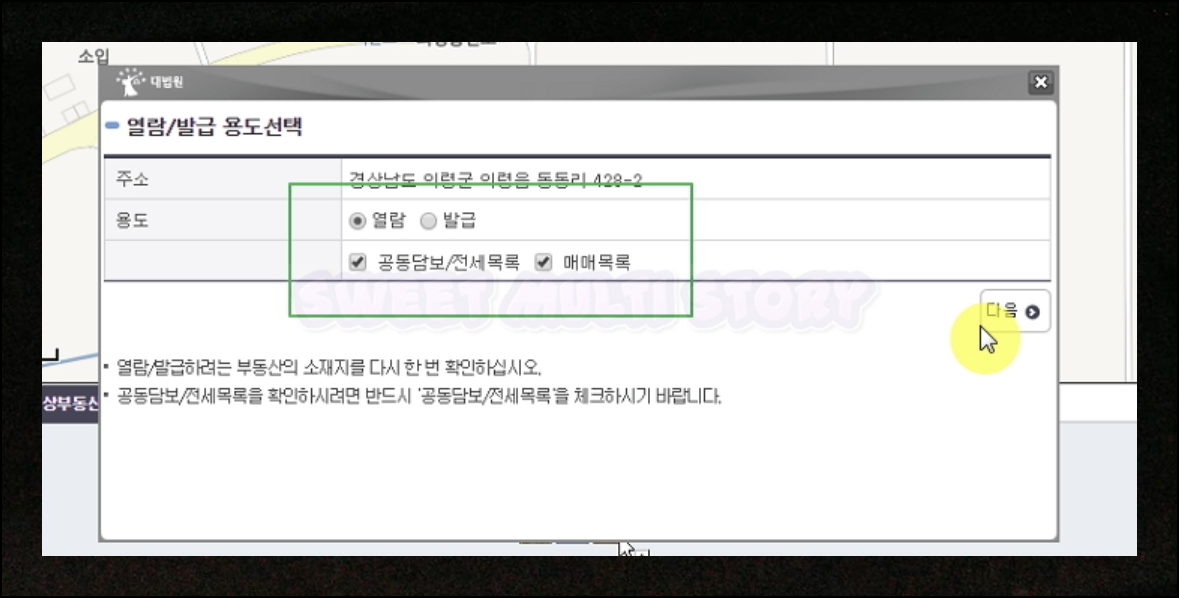 선택한 주소에 대해 조회하고자 하는 용도를 구분해서 선택해야 합니다. 공동담보 설정 현황, 전세권 목록, 매매 이력 등의 상세 정보는 유료 서비스에 해당해요. 무료열람 서비스로는 이러한 정보까지는 확인할 수 없는 구조입니다.