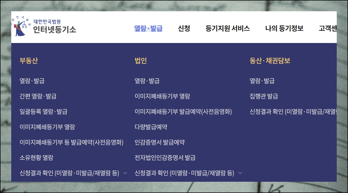 웹사이트 메인 화면에서 등기열람 및 발급 메뉴를 찾아 클릭하세요. 다양한 서비스 중에서 부동산 열람하기를 선택하면 원하는 서비스로 이동합니다. 동산이나 채권담보 관련 정보도 함께 조회할 수 있어요.