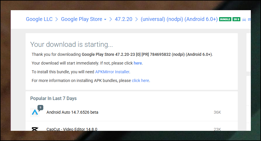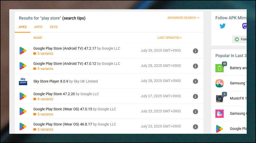 안드로이드 운영체제가 탑재된 기기에서는 apk만 있으면 원하는 애플리케이션을 언제든 설치할 수 있어요. 이런 설치 파일들은 apkmirror 웹사이트에서 쉽게 구할 수 있습니다. 모든 앱에 대한 수동 설치 파일을 다 찾을 수는 없지만, 구글 플레이스토어 같은 주요 앱들은 대부분 업로드되어 있어요.
