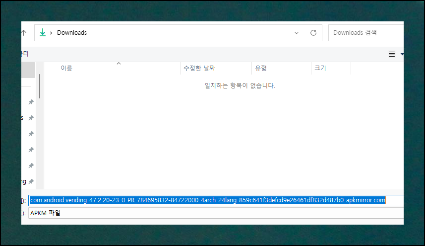 마침내 우리가 찾고 있던 파일을 성공적으로 다운받았습니다. 구글 플레이스토어 apk 파일의 이름이 정말로 길고 복잡해 보여요. 앱의 버전 정보와 호환성 데이터가 모두 파일명에 포함되어 있어서 그러합니다.
