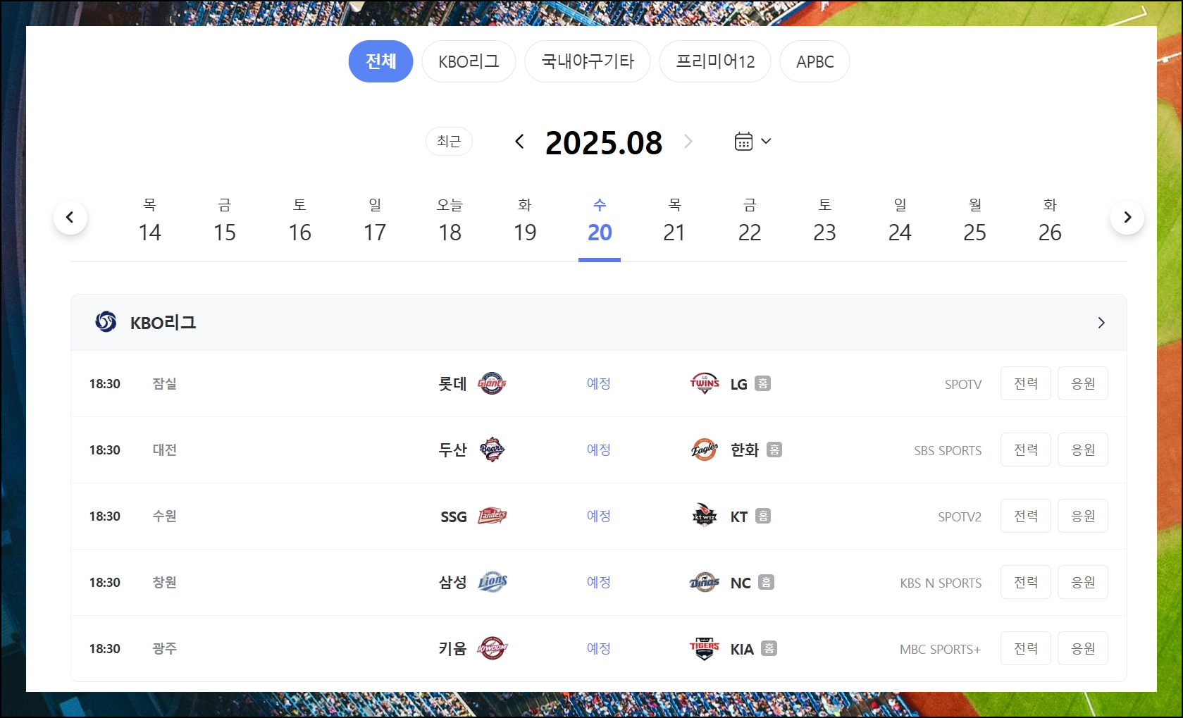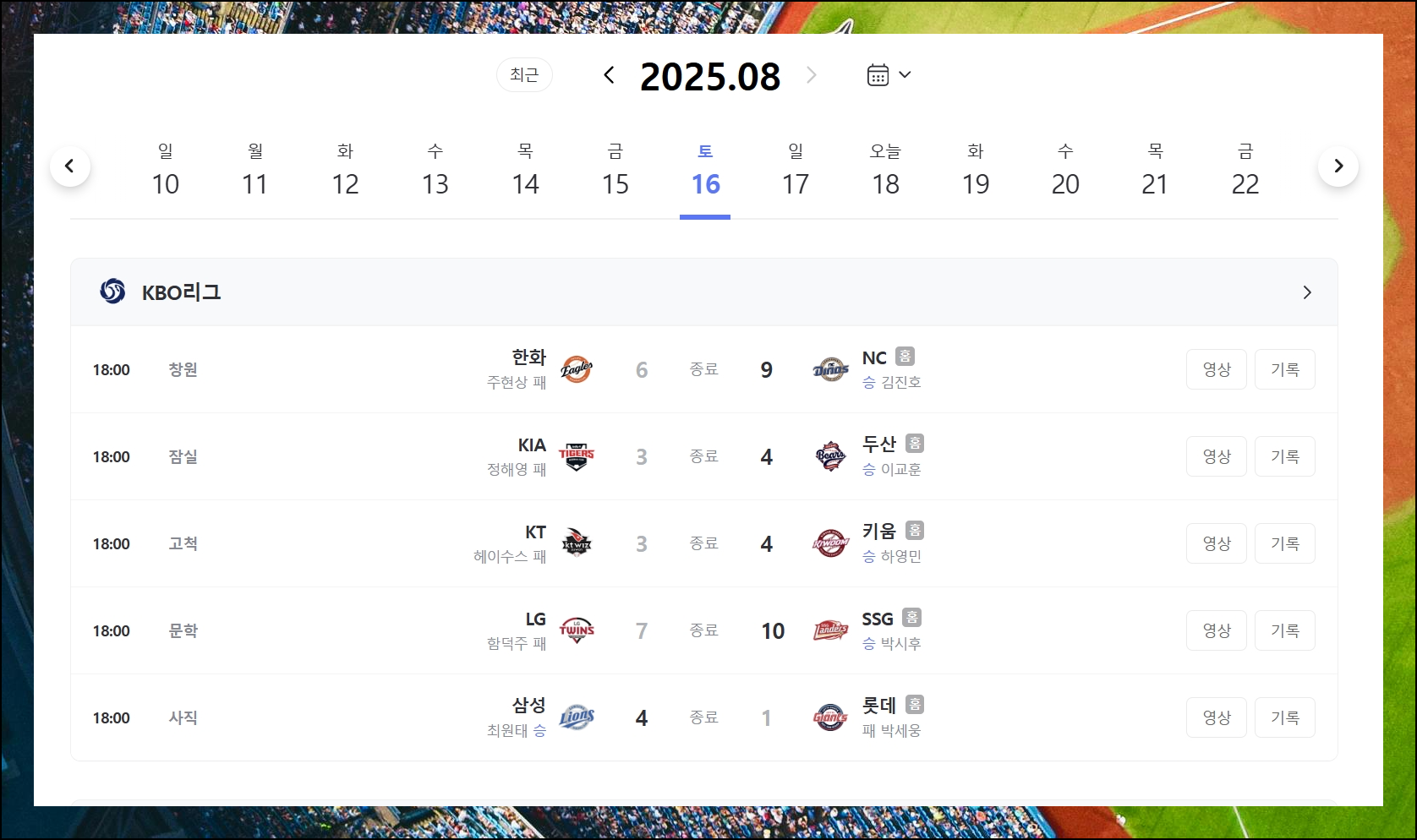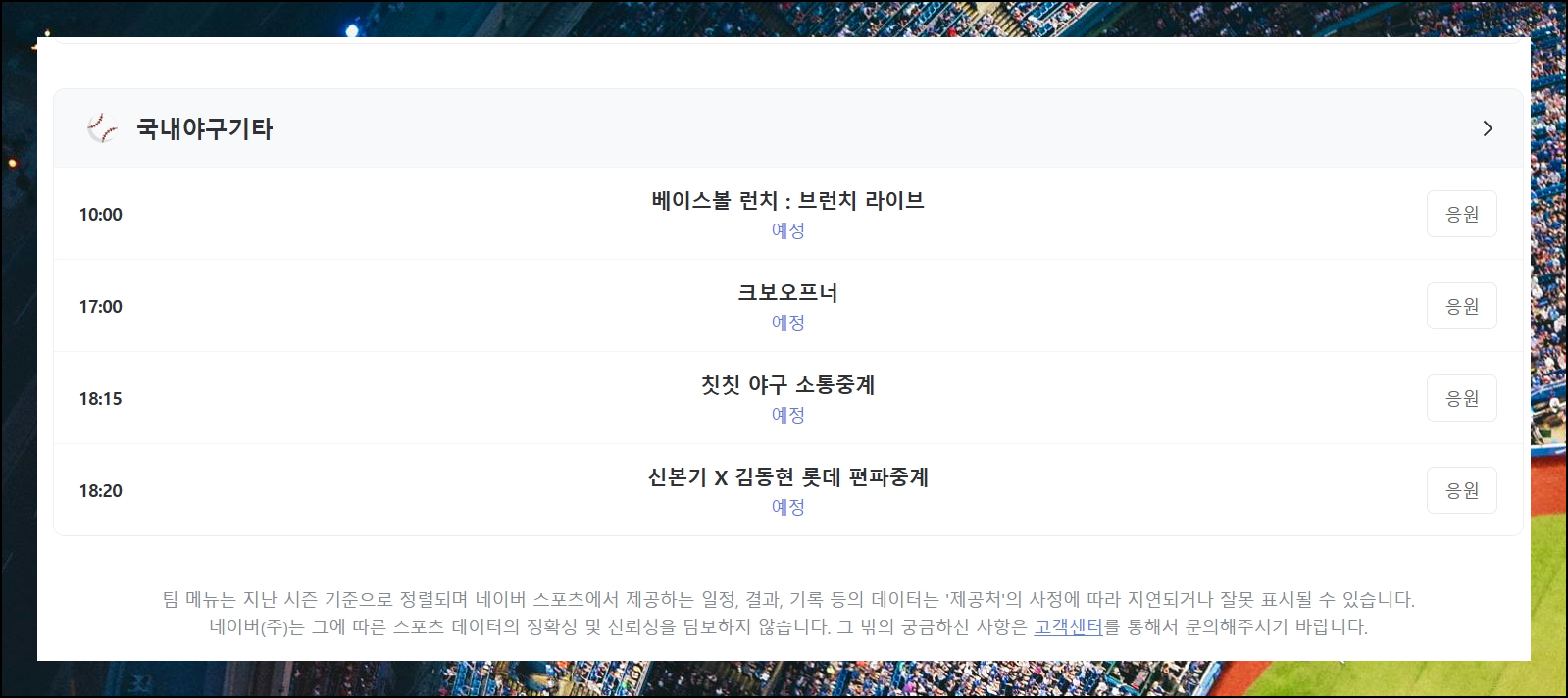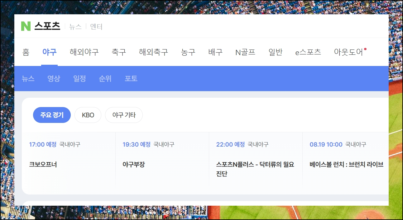 네이버 스포츠 홈페이지로 들어간 다음 상단 메뉴에서 야구를 선택하세요. 영상 시청을 위해서는 일정 및 결과 섹션으로 가면 됩니다. 이 페이지에서는 당일 열리는 경기뿐만 아니라 향후 예정된 모든 일정도 한눈에 볼 수 있어요.