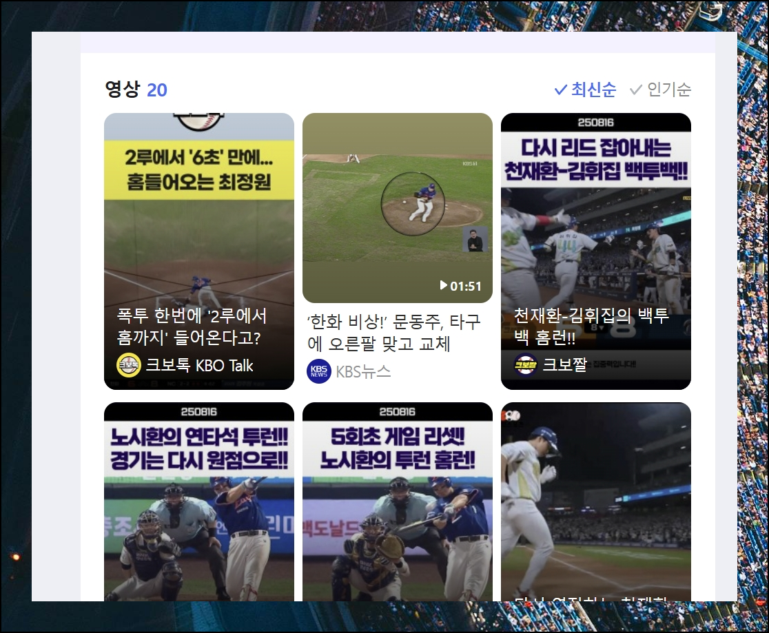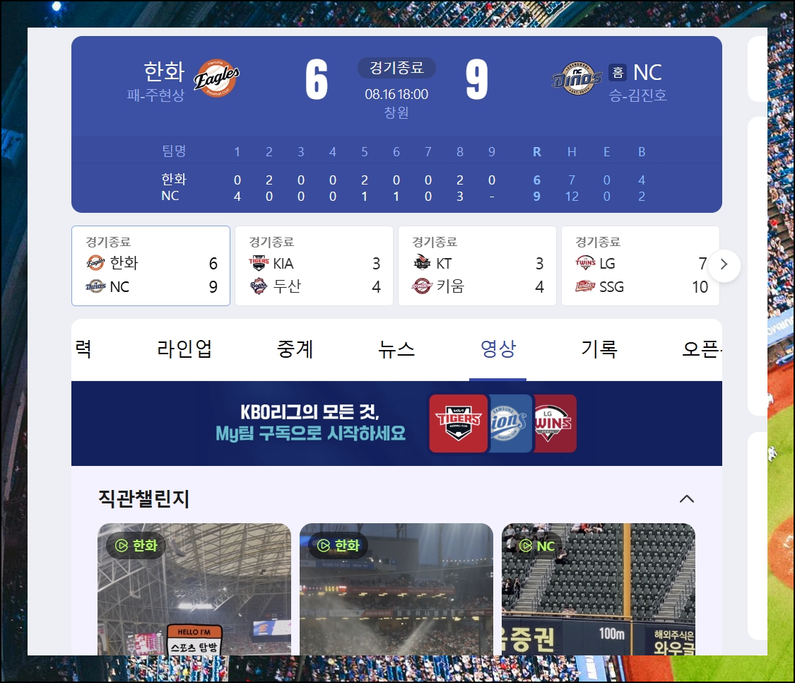 과거 매치의 풀 영상뿐만 아니라 주요 장면들만 편집한 하이라이트 영상도 시청 가능합니다. 경기기록 탭에서는 스코어보드와 함께 타자별 세부 성적을 확인할 수 있어요. 생중계를 놓친 야구 경기의 결과는 물론 선수 개별 성과도 자세히 알 수 있습니다.
