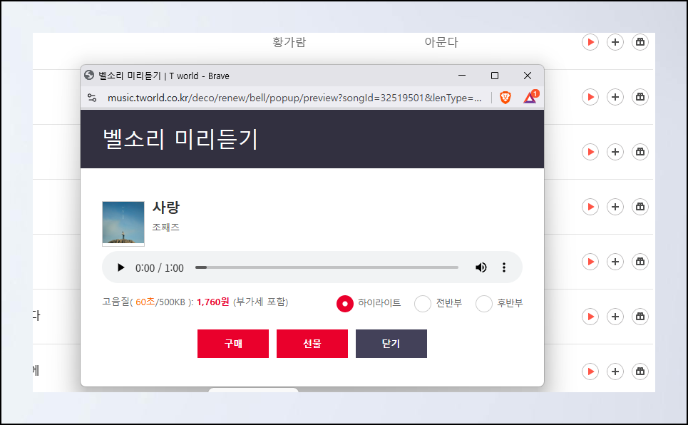 티월드의 가장 큰 장점은 구매 전에 실제 음질을 확인할 수 있다는 거예요. 하이라이트 구간, 처음 부분, 마지막 부분 중 원하는 것을 선택해서 들을 수 있어요. 플레이어 우측의 메뉴 아이콘을 클릭하면 다운로드 옵션이 보이는데, 이걸 누르면 오디오 파일로 저장할 수 있어요.