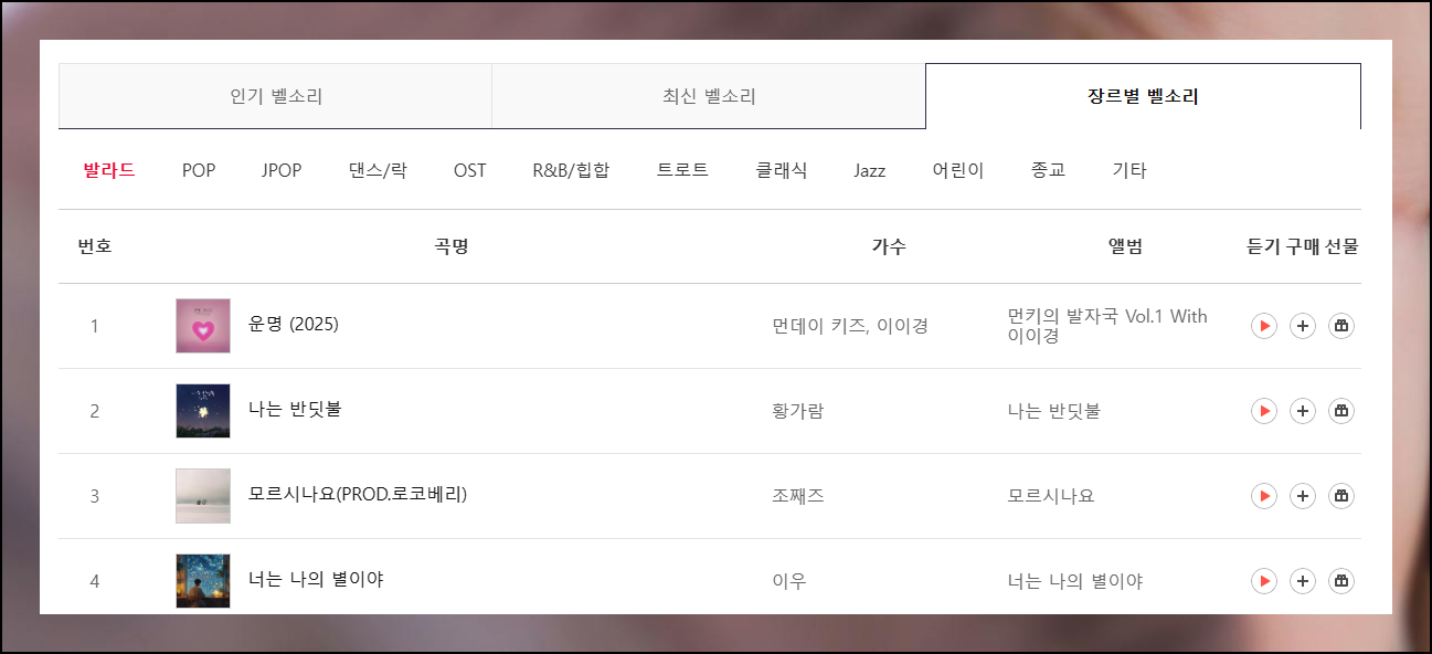 최신 히트곡이나 인기 순위 외에도 세부 장르로 구분된 차트들도 제공되고 있어요. 발라드와 팝, 힙합 같은 메인스트림 뮤직부터 클래식과 재즈까지 폭넓게 분류되어 있어요. 이렇게 세분화된 카테고리 덕분에 각자의 음악적 취향에 맞는 벨소리 음원을 쉽게 추천받을 수 있어요.