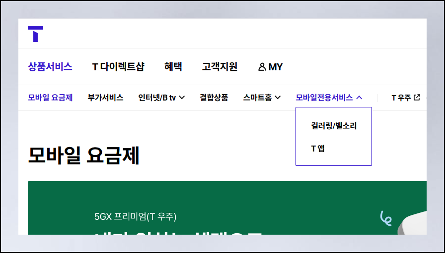 티월드 메인 페이지에 접속한 후 상단에서 상품서비스 메뉴를 찾아 클릭해주세요. 모바일 서비스들이 정리된 목록이 나타나면 그중에서 컬러링과 벨소리 섹션을 선택하면 돼요.