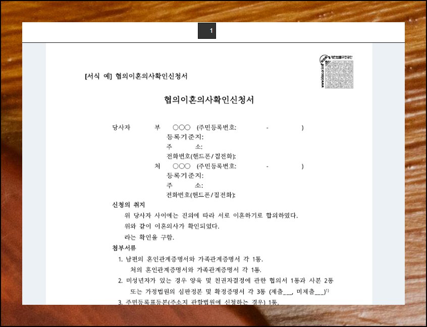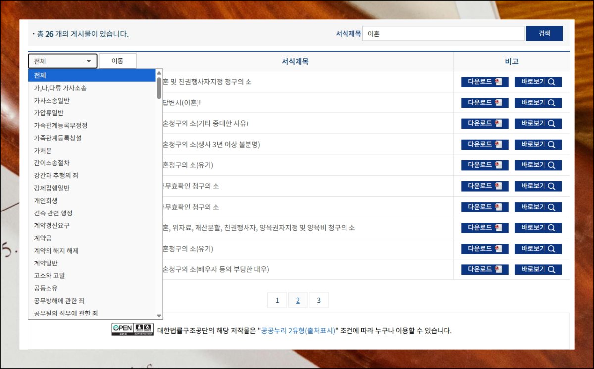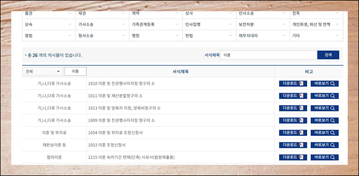 이혼과 관련된 자료는 총 26종이 체계적으로 준비되어 있습니다. 검색창에 원하는 키워드를 입력하시면 관련 자료들을 한 번에 확인할 수 있어요. 가정법원에 제출해야 하는 각종 이혼서류가 명확하게 분류되어 있습니다.