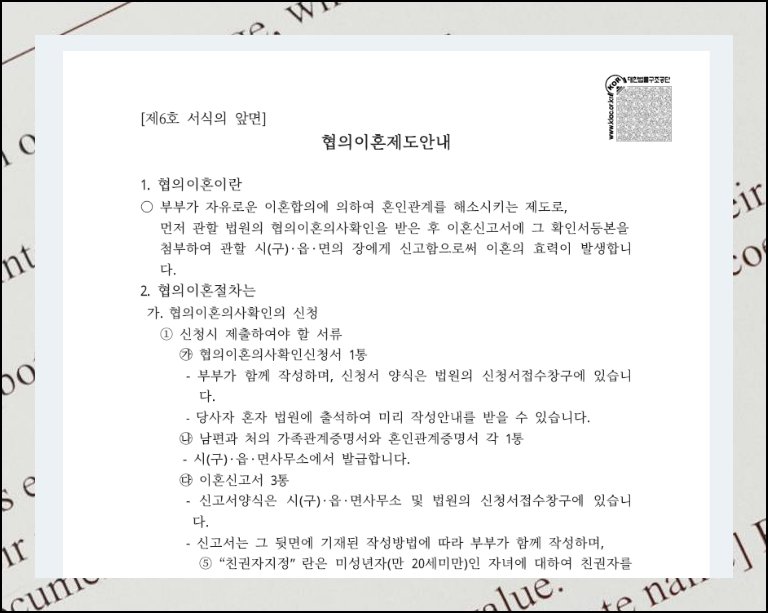 협의이혼 외의 다른 상황이더라도 걱정하실 필요 없어요. 대한법률구조공단 홈페이지를 방문하면 각기 다른 상황에 적합한 이혼서류 관련 문서를 쉽게 찾아볼 수 있습니다. 개별 상황에 맞춤화된 안내가 체계적으로 정리되어 있어요. 가정법원 방문 이전에 미리 살펴보시면 전체적인 절차가 훨씬 원활해집니다.
