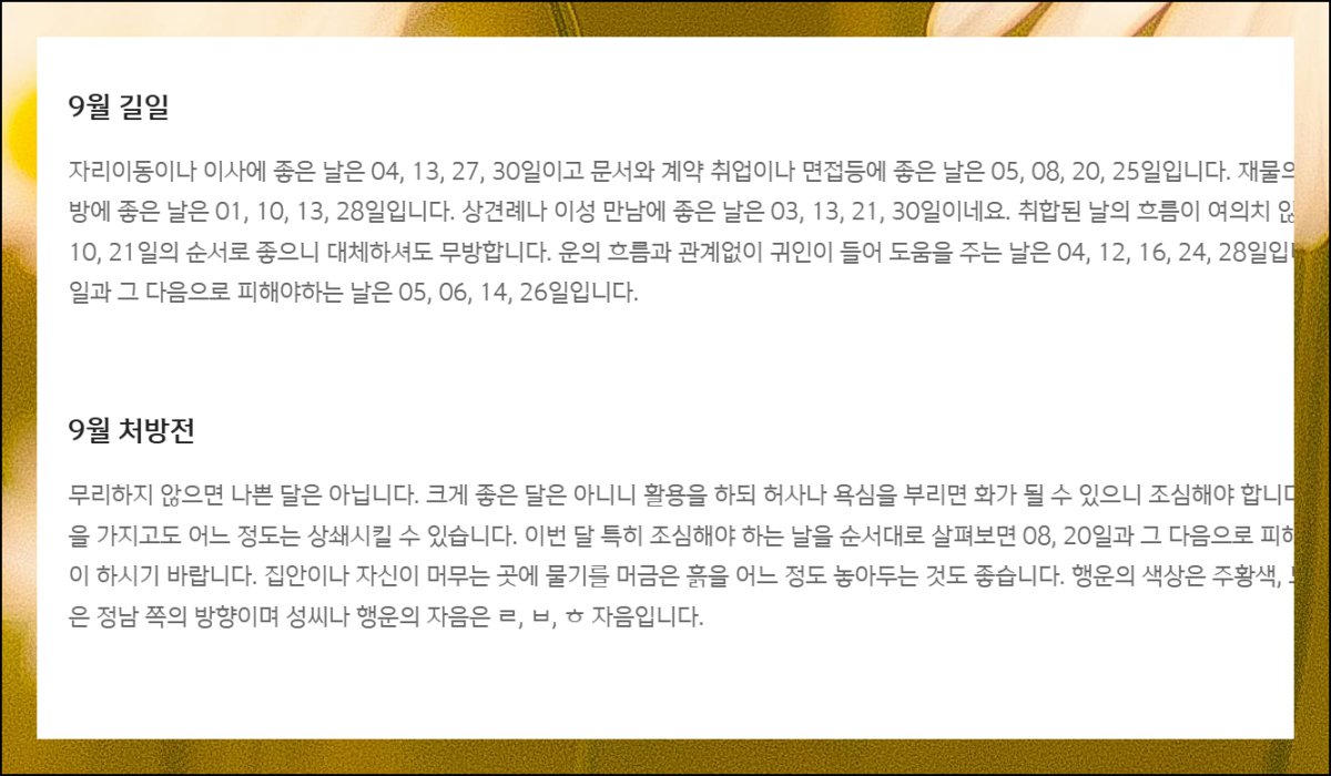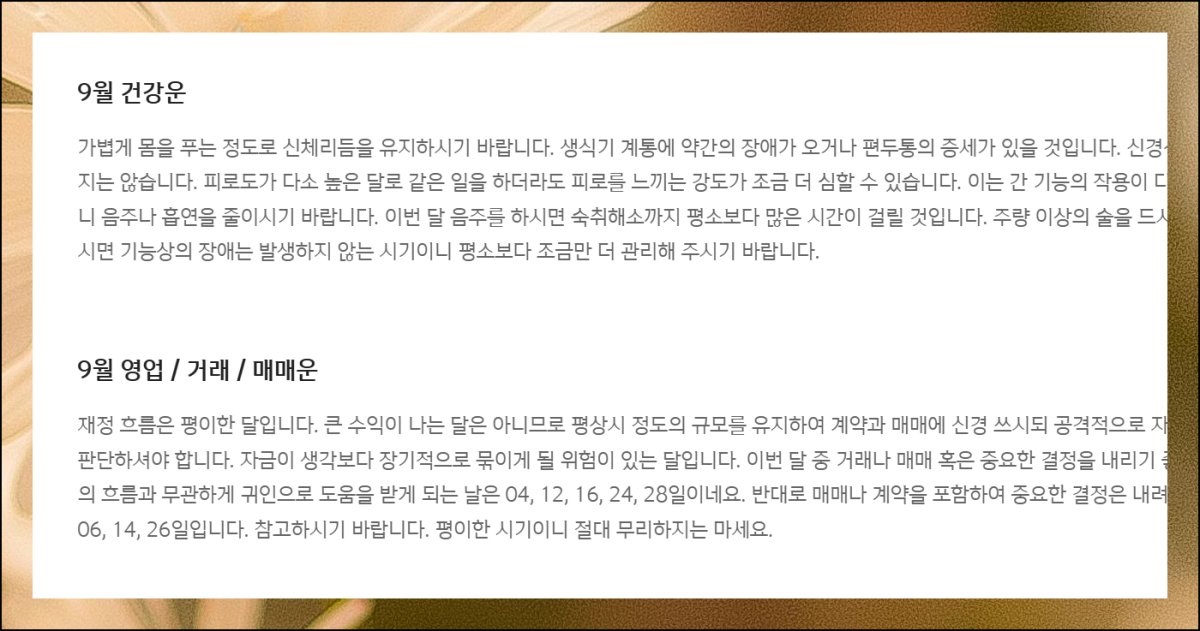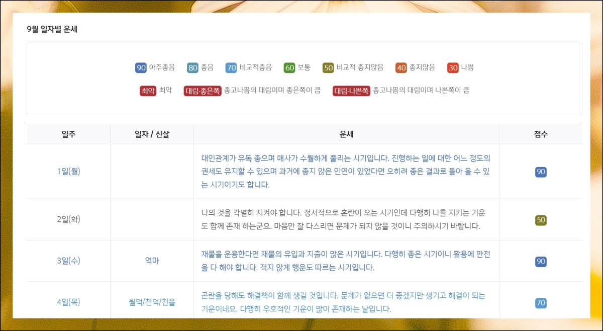 월간 종합운을 확인해보면 우선 9월 총론 해석이 나와요. 일자별 운세 부분을 살펴보면 매일의 무료운세 결과를 점수로 표시해줘서 좋고 나쁨을 즉시 판단할 수 있어요. 각 날짜마다 어떤 종류의 운이 들어오는지 상세한 풀이도 함께 제공됩니다.