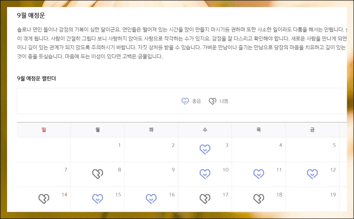페이지를 아래로 스크롤하면 캘린더 형태의 역술 정보도 확인 가능해요. 재물운 달력에서는 투자하기 좋은 날이나 지출을 피해야 할 날짜를 알려주고, 애정운 달력은 상견례나 데이트 날짜를 정할 때 유용한 참고 자료가 됩니다.