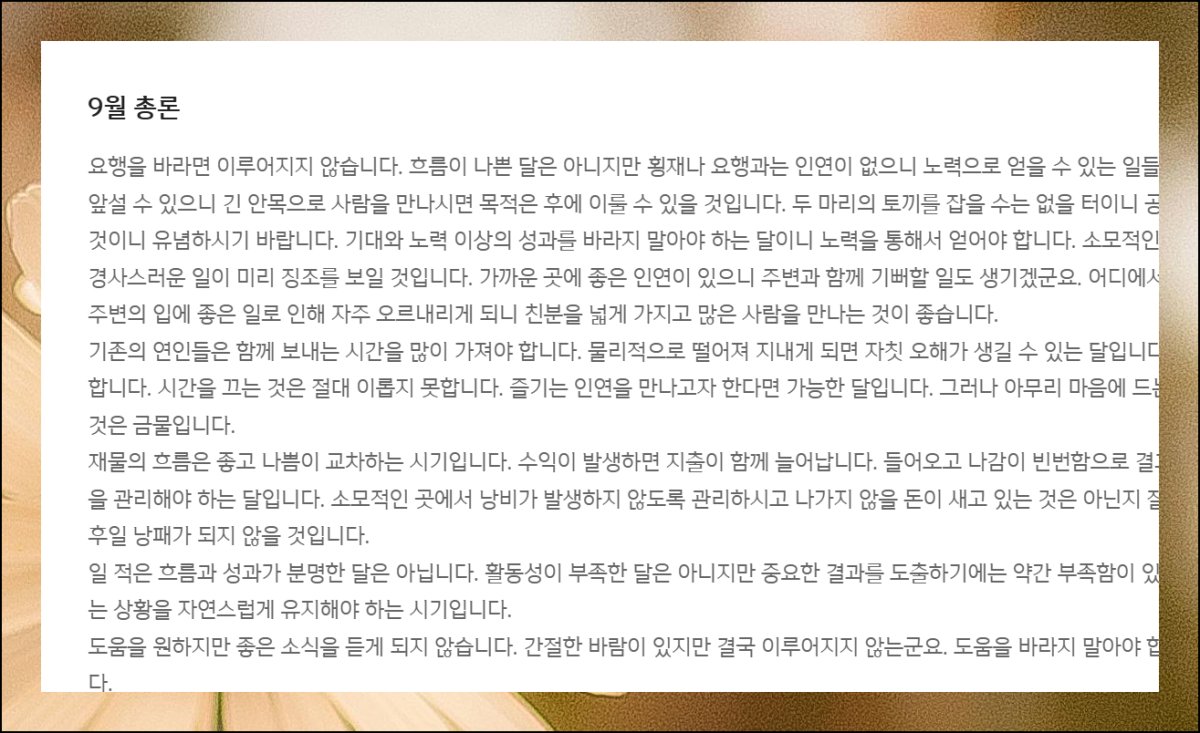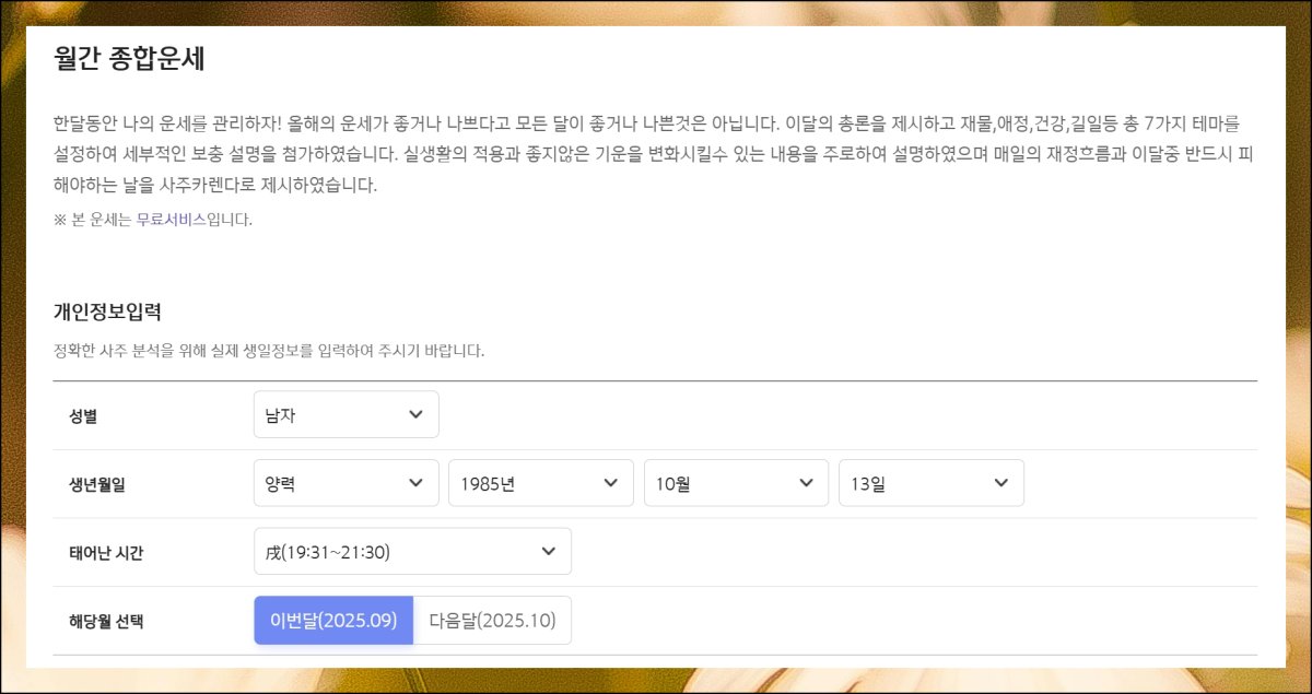 여러 서비스 중에서도 "월간 종합운"를 추천해요. 비교적 짧은 기간임에도 상세한 해석을 제공하거든요. 자주 활용할 계획이라면 해당 페이지를 즐겨찾기로 등록해두면 좋습니다. 그러면 인터넷 사용 중에 원클릭으로 바로가기가 가능해져요.