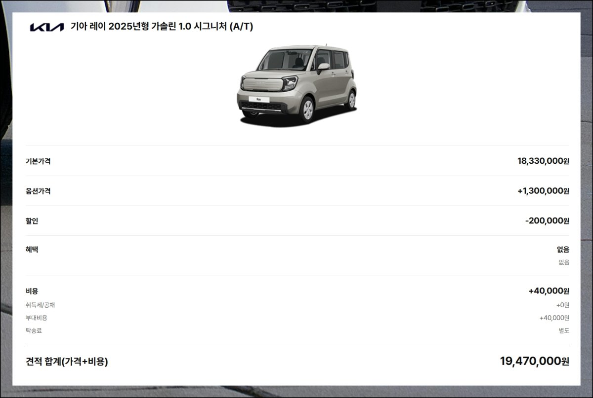 견적 버튼을 클릭하면 상세한 신차가격표 화면이 나타나요. 세부 트림과 선택 옵션, 할인 항목, 등록 및 추가 비용을 하나씩 선택해보세요. 그러면 실제로 지불해야 할 총액이 자동으로 계산됩니다. 할부를 이용한다면 캐시백이나 금리 우대 같은 추가 혜택으로 부담을 더 줄일 수 있어요.