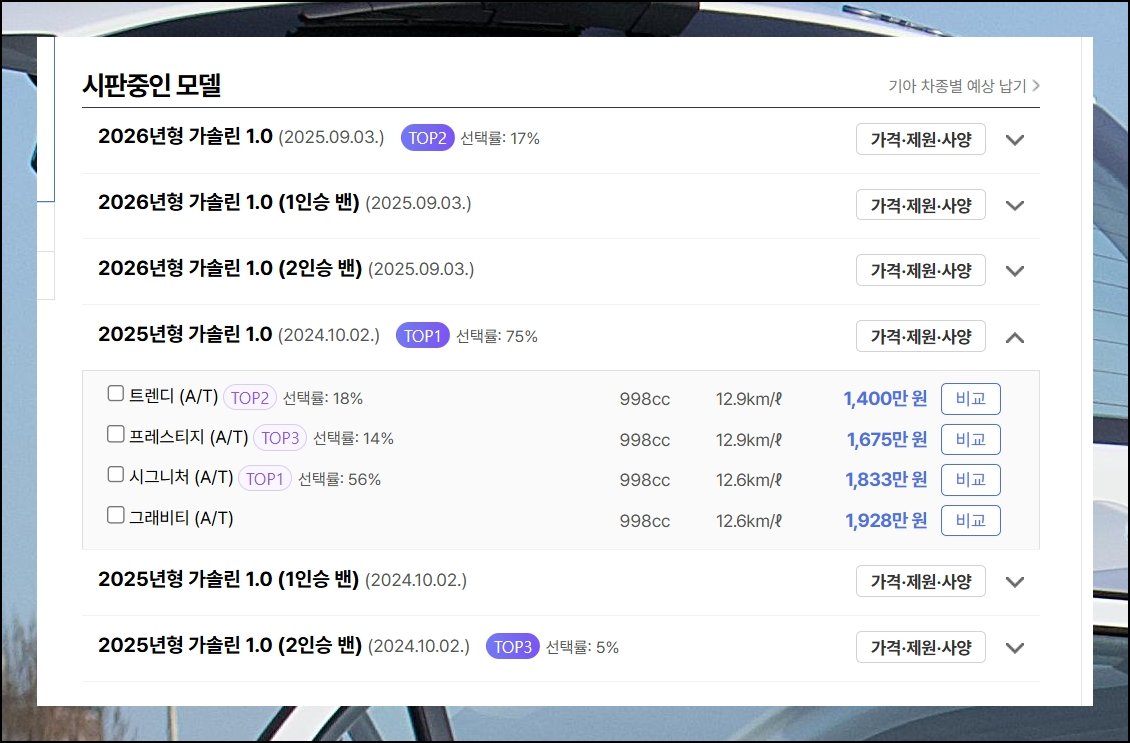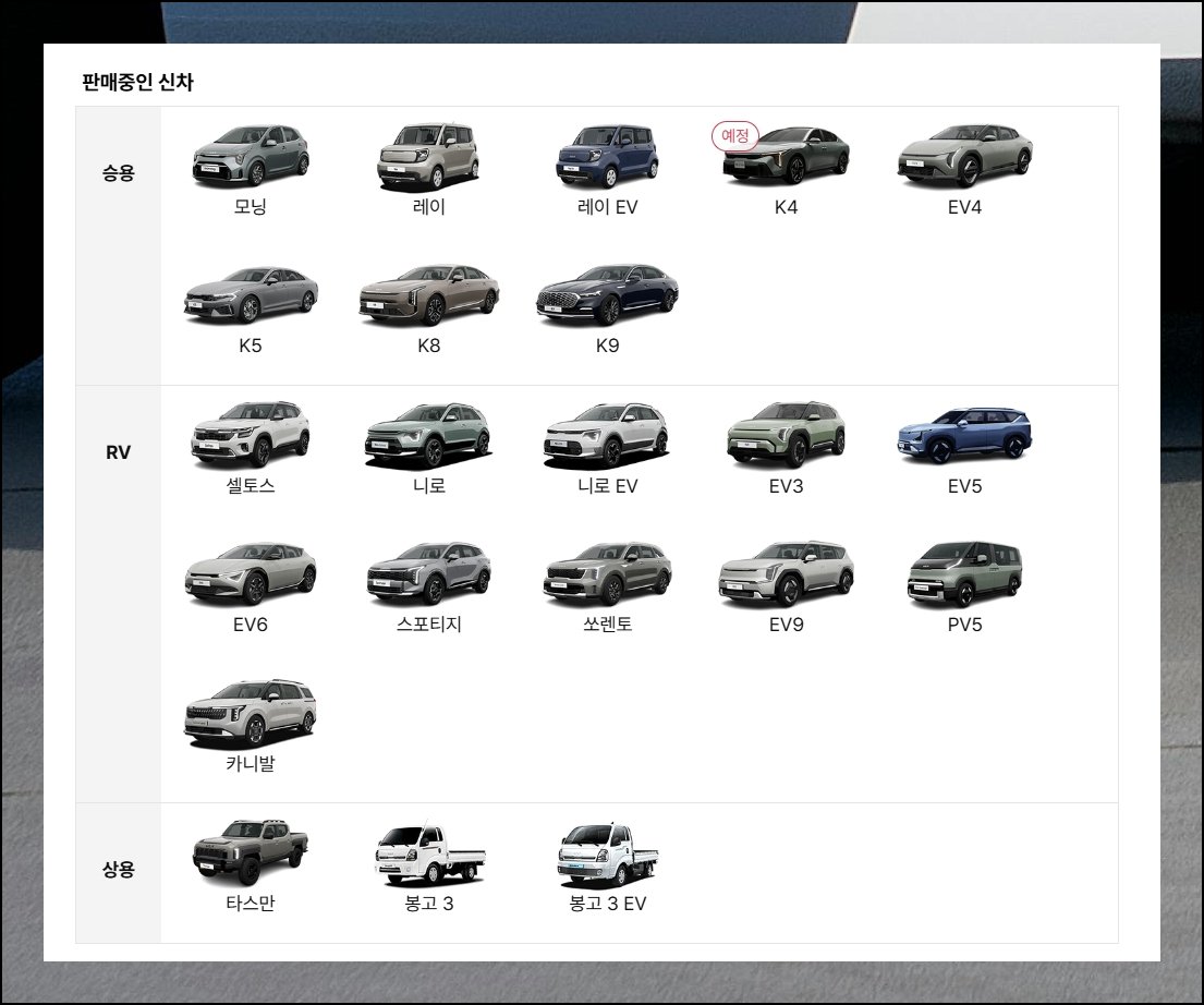 기아자동차 판매조건 화면에서 더 보기를 누르면 어떻게 될까요. 각 차량별 상세 가격표와 적용 가능한 혜택 내용을 볼 수 있습니다. 2025년 기준 재고 차량 할인부터 시작해서 전시용 차량 조건, 카드사 제휴 프로그램까지 폭넓게 확인할 수 있어요. 정확한 금액이 궁금하다면 모델명을 선택한 뒤 견적 메뉴로 들어가보세요.