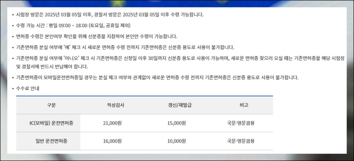 면허증은 시험장이나 경찰서에서 받을 수 있습니다. 평일 오전 9시부터 저녁 6시 사이에 수령 가능해요. 빠르게 받고 싶으시다면 시험장 방문을 추천합니다. 분실 신고 후 재발급을 요청하면 시험장이 경찰서보다 발급 속도가 더 빠르거든요.