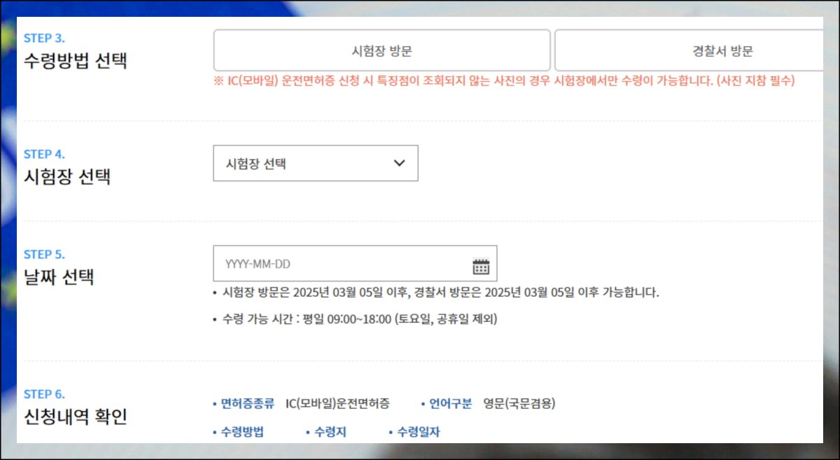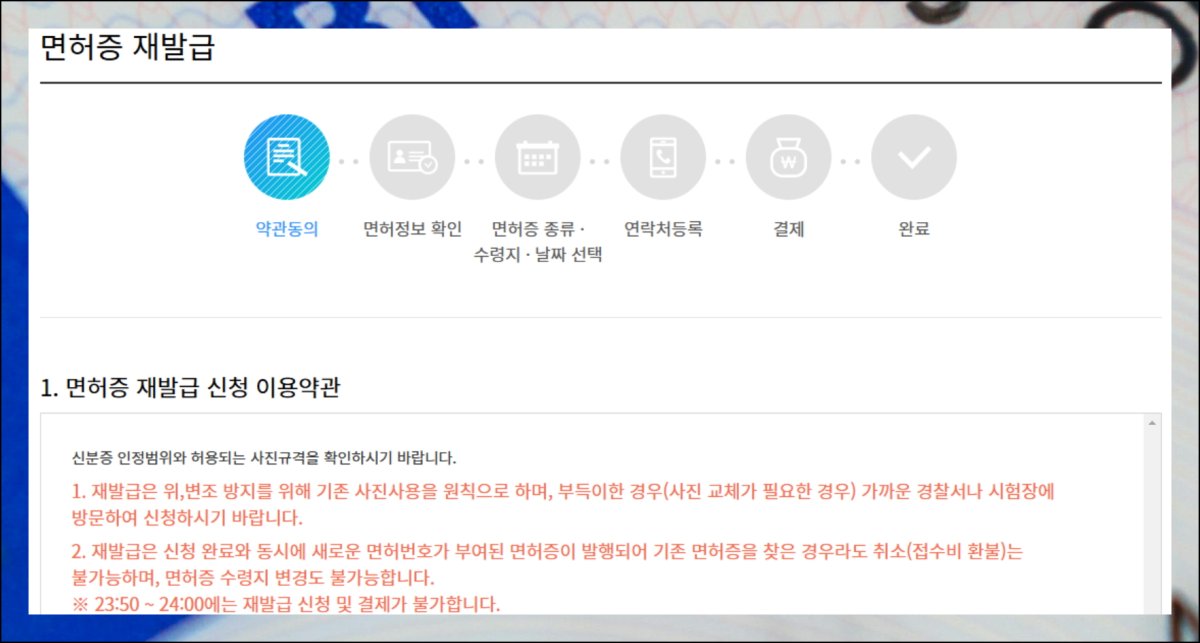 전체 절차는 6개 단계로 나뉘어 있어요. 약관 동의부터 시작해서 본인 정보를 확인하게 됩니다. 수령할 장소와 연락처를 입력하면 돼요. 재발급 시에는 기존에 등록된 사진을 그대로 활용합니다. 새로운 사진으로 바꾸고 싶다면 경찰서나 시험장에 직접 방문해야 해요.