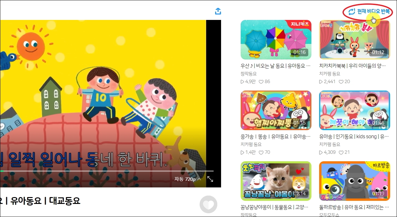▼아이가 하나의 유아동요 콘텐츠를 반복하는 것을 좋아하거나 이런 식의 재생이 필요할 때는 [현재 비디오 반복] 버튼을 클릭하면 됩니다. 그럼 하나의 영상을 가지고 계속 연속 듣기를 진행할 수 있습니다.