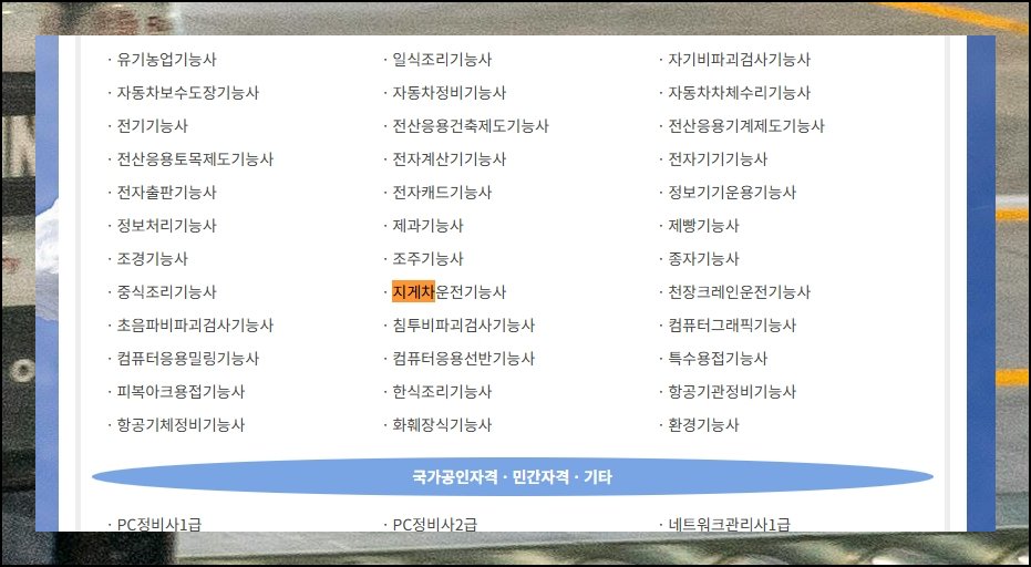플랫폼에 들어가면 여러 종목이 영역별로 구분되어 나와 있을 거예요. 건설, 전력, 산업기계 등 계열로 묶인 구조가 일반적입니다. 지게차 운전기능사는 기계 계열이나 산업기술 메뉴에서 찾아볼 수 있어요.