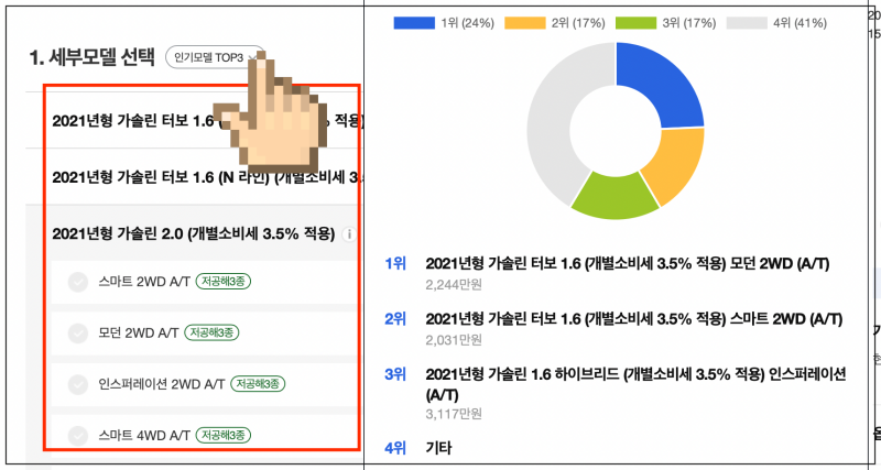 정확한 현대자동차 가격표 확인을 위해 몇 가지 선택을 좀 해야 해요. 가장 먼저 세부모델을 선택해야 하는데요. 구매 의향이 있으신 분들은 이미 마음속으로 골라 놓은 것이 있을 거에요. 그렇지 않고, 가격 정보를 얻기 위해서라면 현대자동차의 인기 모델을 참고하여 선택하면 돼요.