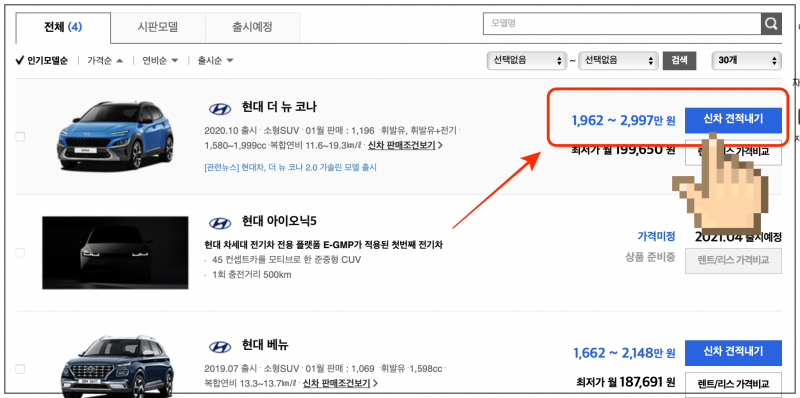 제가 입력한 조건을 충족하는 현대자동차 모델이 나타났어요. 리스트를 통해 신차 정보와 가격표 확인이 가능한데요. 가격을 보면 범위로 되어 있어서 감이 안 잡힐 수 있는데요. 좀 더 정확한 가격표 확인을 위해 "신차 견적내기"를 클릭해 주세요.