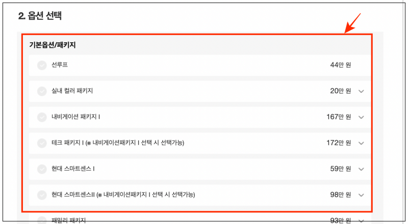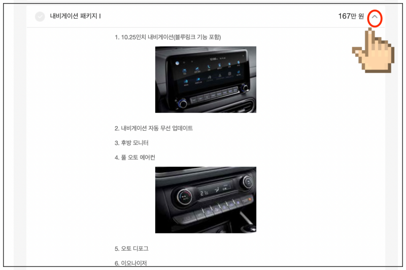 현대자동차에서 정한 옵션 이름만 가지고는 해당 옵션이 무슨 기능을 하는지 모를 수 있는데요. 그럼 경우에는 가격표 바로 우측에 있는 화살표를 클릭해 보세요. 그럼 설명이 나타나요.