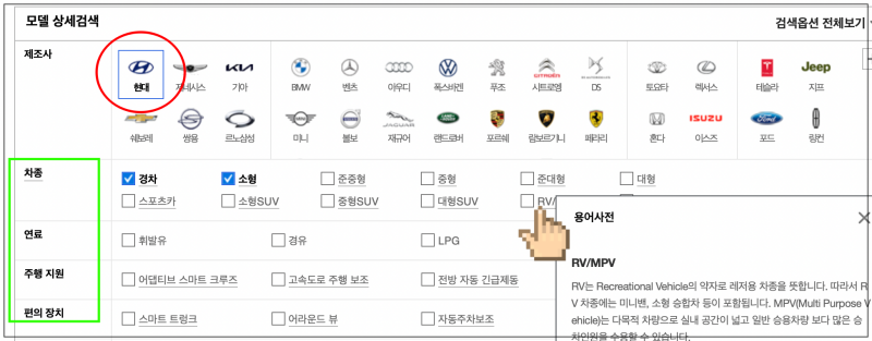 모든 현대자동차 가격표를 알아볼 수 있어요. 하지만 사람마다 원하는 모델은 한정되어 있죠. 그렇기 때문에 모델 상세검색 기능을 이용하면 좋아요. 그럼 원하는 모델에 대해서만 신차 가격표를 확인하고, 비교해 볼 수 있기 때문이에요. 차종, 연료 타입, 주행 지원, 편의 장치에 관한 부분을 선택해 주세요. 자동차에 대해 잘 모르는 분들은 현대자동차의 차종이 헷갈리실 수 있는데요. 차종의 이름을 마우스로 클릭해 보세요. 그럼 용어사전을 통해 선택한 용어가 무엇을 의미하는지 알아볼 수 있어요.