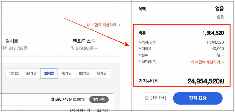 마지막으로 취득세, 공채 비용, 부대비용, 탁송료 등에 대한 부분을 선택해 주세요. 그럼 본인이 원하는 모델로 현대자동차를 구매할 때 얼마의 비용이 드는지 최종 가격을 확인할 수 있어요.