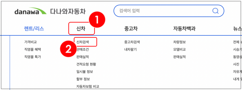 다나와 자동차 사이트에 접속했어요. 이곳에서는 차량 구매에 관련된 대부분의 정보를 제공하는 곳인데요. 신차 가격표 외에도 중고차, 렌트, 리스 차량에 대해 알아볼 수 있어요. 더 나아가 판매실적이나 차량정보, 모델비교에 대한 것도 알아볼 수 있죠. 메뉴에서 "신차 검색"을 클릭해 주세요.