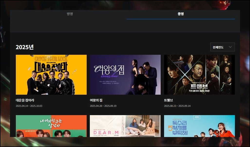 사이트에 들어간 뒤 상단 카테고리를 골라 누르기만 하면 돼요. 마지막 썸머, 화려한 날들 등 현재 전파를 타고 있는 드라마가 즉각 나열됩니다. 지금 어떤 타이틀이 시청자 관심을 끌고 있는지 알고 싶다면 여기를 반드시 둘러보세요.