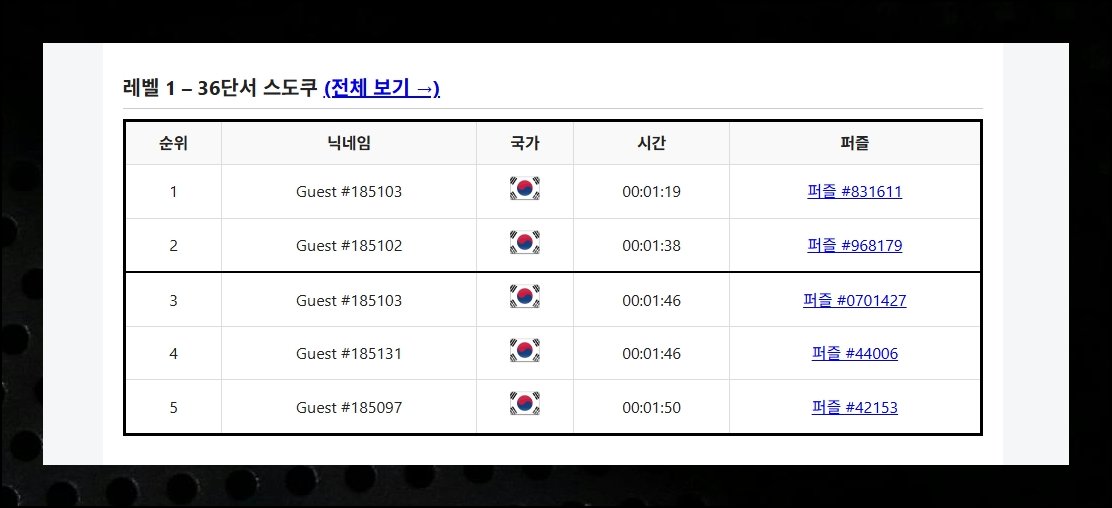 가장 낮은 레벨의 스도쿠를 한번 시도해봤습니다. 3분 만에 끝냈는데 난이도가 낮아서인지 금방 풀렸어요. 랭킹을 살펴보니 최상위에 이름이 올라가 있더라고요. 문제 모음에서 입문용 퍼즐을 선택하면 즉시 플레이가 시작됩니다. 다른 사람들의 순위도 확인할 수 있으니 높은 순위에 도전해보세요.