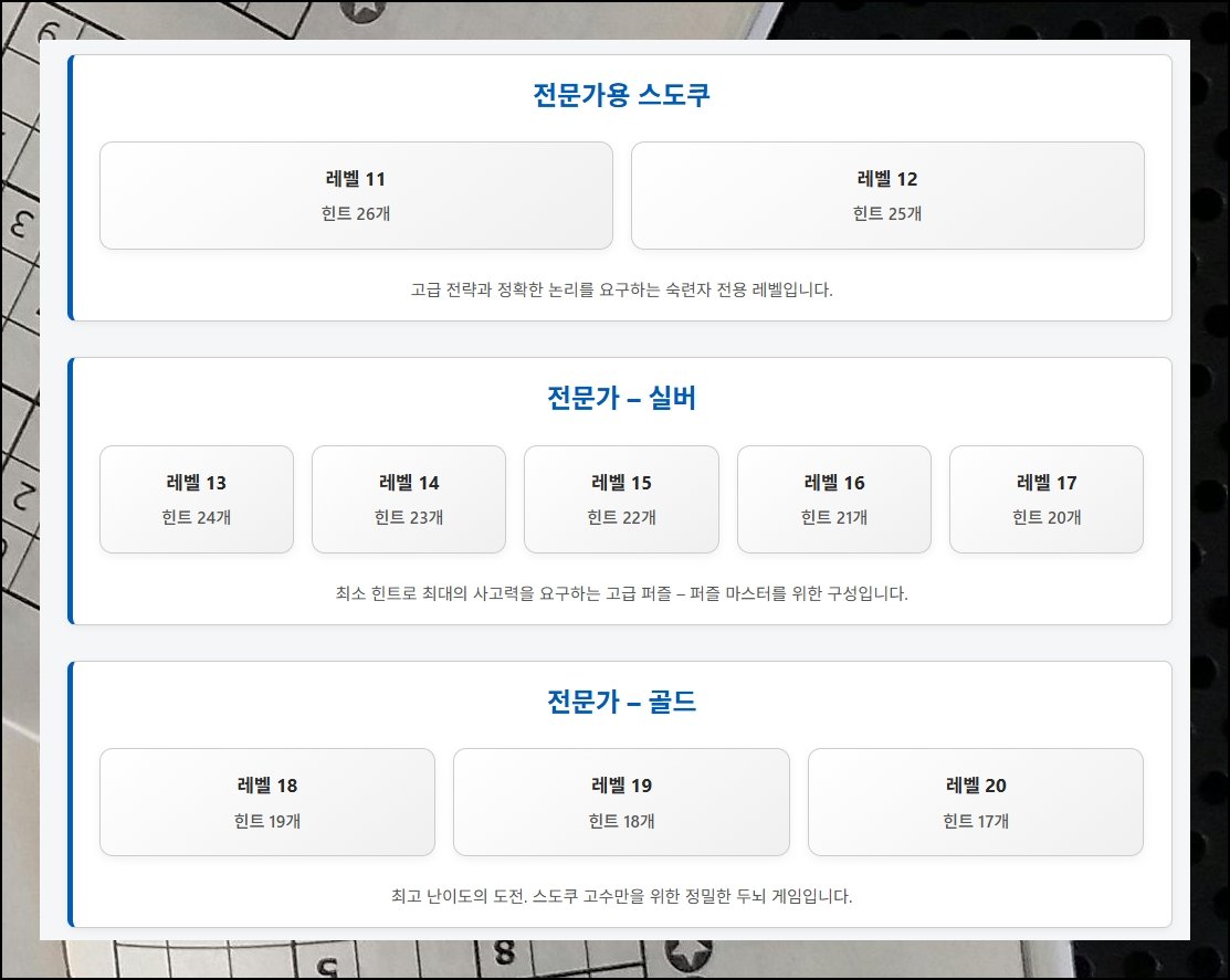 페이지를 아래로 내리면 풍부한 퍼즐 모음이 펼쳐져요. 9x9 기준으로 총 20개 단계가 마련됐습니다. 입문자부터 숙련자까지 6개 구간으로 세밀하게 나뉘어져 있어요. 처음이라면 가장 쉬운 문제부터 순서대로 올라가보길 추천합니다.