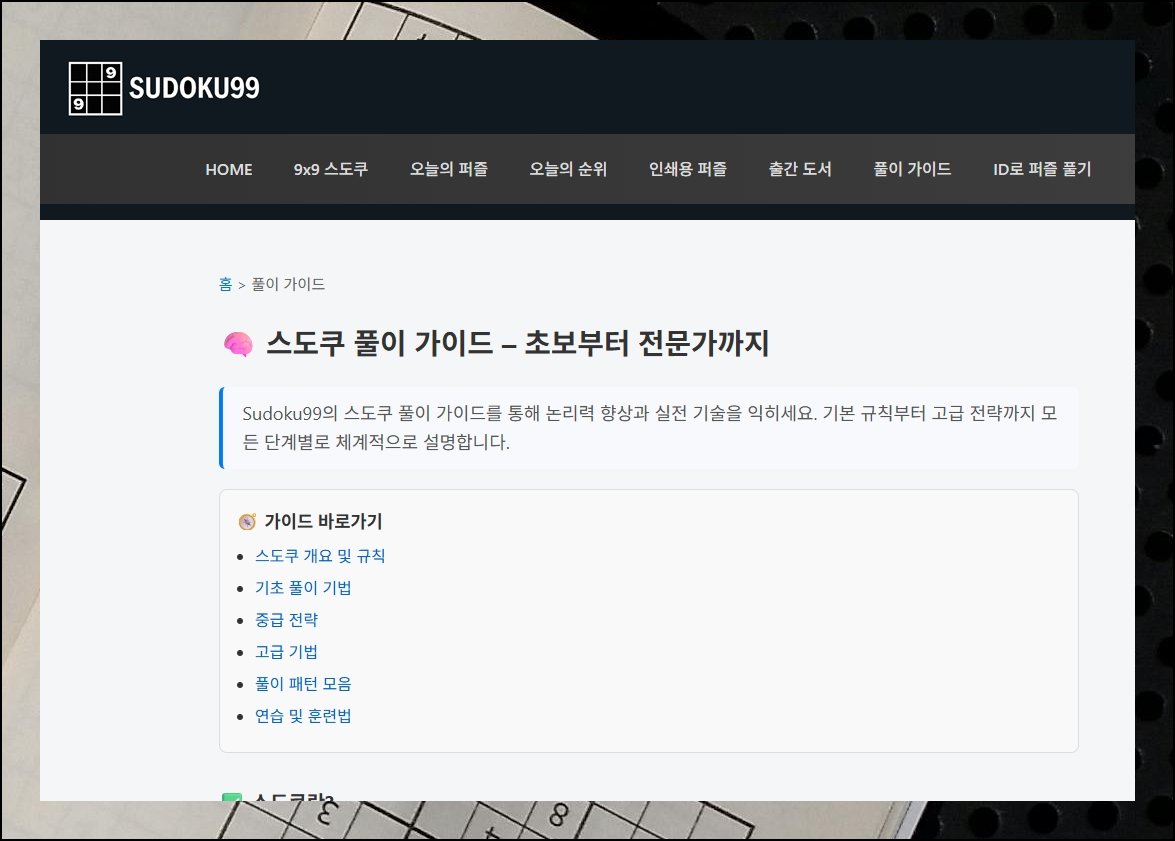 입문자용부터 고난도까지 레벨별로 잘 갖춰진 모음을 무료로 이용할 수 있고, 풀이 규칙 안내까지 제공되니 스도쿠 경험이 전혀 없어도 부담 없이 도전해볼 수 있습니다. 오늘은 회원가입조차 필요 없는 온라인 사이트에서 다양한 문제를 즐기는 방법을 차근차근 알려드릴게요.