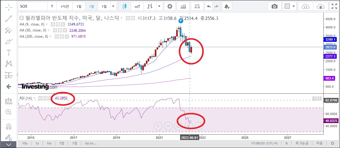 ▼삼성전자 주식을 가지고 있는 분들이라면 필라델피아 반도체 지수에 대하여 관심이 많을 겁니다. 전날 밤에 해당 지표가 상승하면 삼성전자의 시세도 오르는 경우가 많거든요. 반대로 하락할 때에도 유사한 흐름을 보이곤 했죠. 다음은 월봉으로 필라델피아 반도체 지수에 대한 그래프를 나타낸 것입니다. RSI 심리도를 살펴보았을 때 살짝 반등의 모습을 보이고 있는데요. 50달 이동평균선 부근에서 저항을 받는 모습도 최근 몇 년 동안 발생했던 패턴입니다.