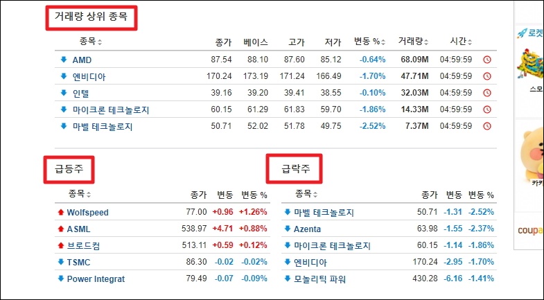 ▼필라델피아 반도체 지수는 미국의 여러 종목을 묶어서 만든 지표입니다. 그렇기 때문에 여기에 관련 있는 개별 종목이 여러 개 있는데요. 이 중에서 거래량 상위 종목, 상승을 많이 한 종목, 하락을 많이한 종목을 골라서 볼 수 있습니다.