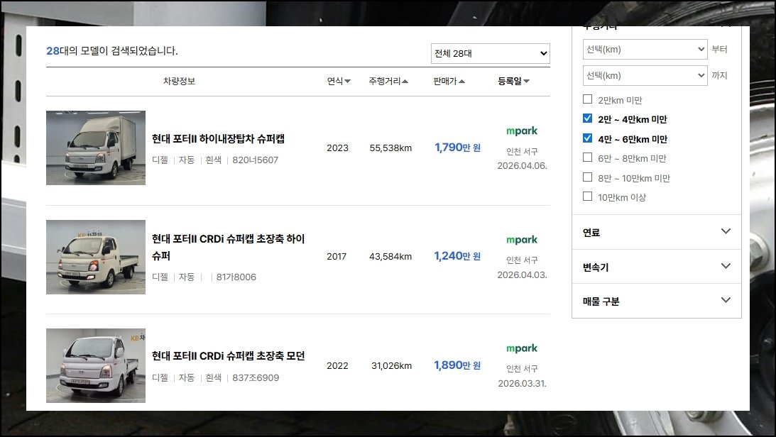 누적 운행 거리를 기준 삼아 중고차 목록을 나눠 정리해 봤어요. 이런 방식을 쓰면 시세 판단이 한결 수월해집니다. 클러치 조작에 자신이 없는 분이라면 오토 미션이 장착된 1톤트럭만 추려서 보시길 권합니다. 세부 조건 탭에서 클릭 한 번이면 간단히 적용돼요. 이렇게 추려낸 리스트를 찬찬히 비교해 보고 여건에 가장 부합하는 한 대를 고르시면 됩니다.